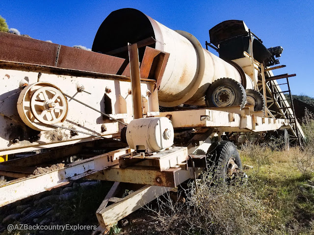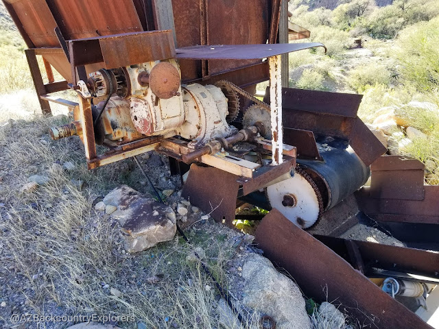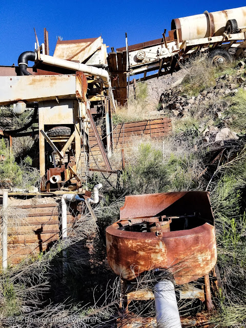 The UFO mine is just outside the border of the Hassayampa River wilderness on Arizona State trust land. It appeared to once be a huge operation and was functional as recently as 1990. It’s marked with a “keep out” sign and has been abandoned for a long time. There’s an old miner Shack, a bulldozer, a loader, a track hoe, and various other mining equipment left behind. The amount of equipment abandoned at the UFO mine is staggering. Pumps, mixers, pulleys, chains, a reel of conveyor belt rubber, and various other things. Not to mention the mill! The UFO mill was phenomenal! It was completely intact, with everything from rubber belts and PVC piping still there.