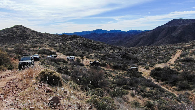 I put a shout-out to a couple of friends. Tad, our social media moderator, and John, the administrator and founder of Retired Renegade Adventures. We then organized a trail ride, and 8 of us showed up for fun. We had a variety of vehicles, including 5 Jeeps, one pulling an overland trailer, 2 Toyota 4Runners, and one Nissan Xterra, all heavily equipped and packed to the tip for an exciting 2-day adventure through the Bradshaw Mountains.
