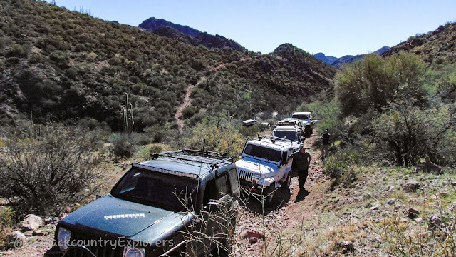It’s a serene feeling waking up to the sound of the flowing Hassayampa River. The first two awake were Todd and me. It was a chilly 49 degrees, and we wasted no time building a fire and preparing breakfast. Soon after everybody woke, we packed up our tents and lined up the rigs for day two of our adventure. The plan was to backtrack to Bradshaw’s grave and head North over Boulder Pass. This section was unexplored by everybody in the group. We didn’t know what to expect, but everyone was ready for the challenge.