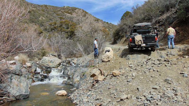 After a good night’s sleep, we woke up to prepare some breakfast and pack up camp. Our camp was located near China Dam, just north of Lake Pleasant along Humbug Creek. There was a good amount of water flowing in the creek. Little did we know, 15 miles upstream Humbug Creek would cause us to pull a winch line. Many in the group were excited to experience the back road to Crown King. With great anticipation, we made our way down Cow Creek Road towards the trailhead. The first stop was the Crown King rock for the iconic flex photo.