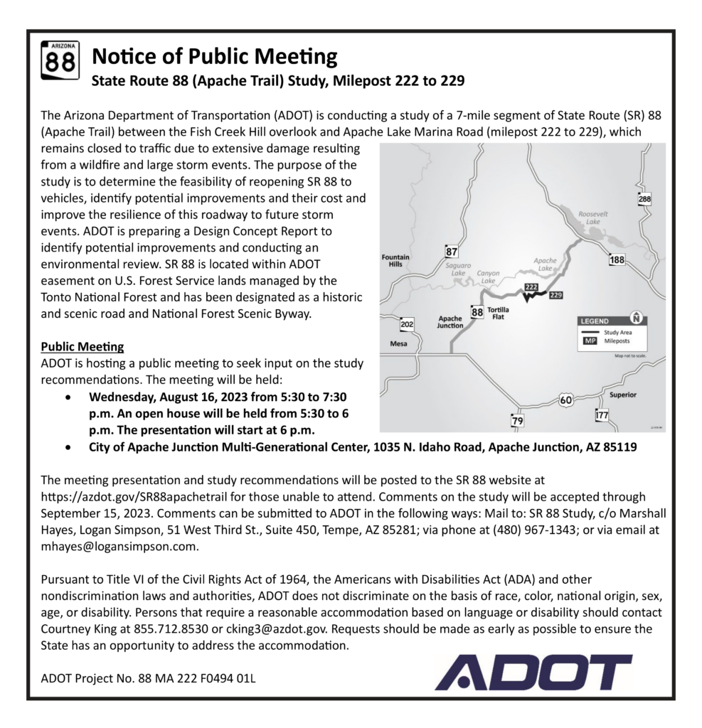 The Arizona Department of Transportation is accepting comments on a feasibility study to reopen the Apache Trail at Fish Creek Hill.