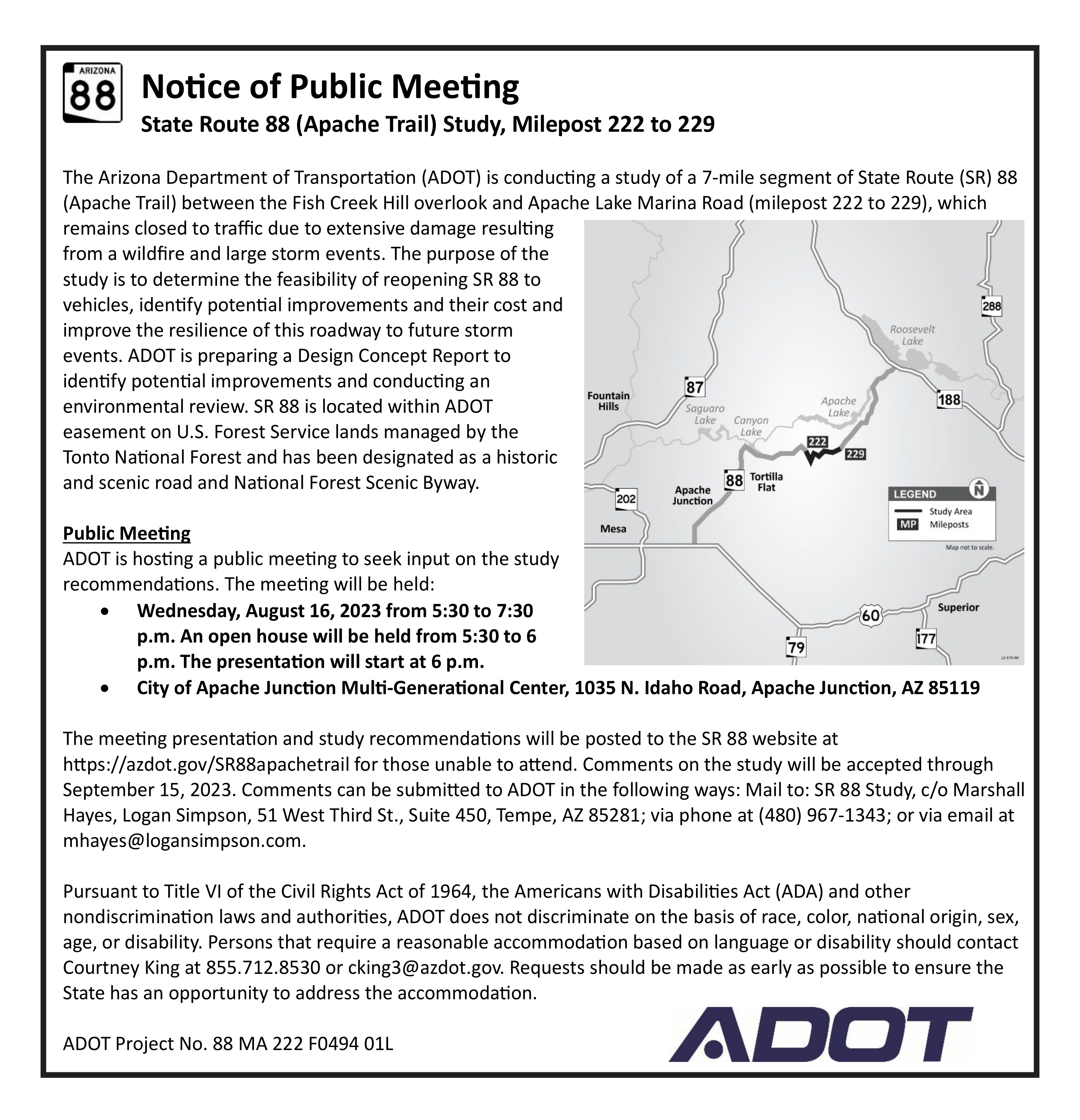 ADOT is organizing a crucial in-person public meeting to actively engage with the community and gather valuable input on the study recommendations. This meeting serves as an exceptional opportunity for individuals to express their opinions, concerns, and suggestions regarding the study. In addition to the in-person gathering, ADOT is also welcoming comments via email, telephone, and traditional mail.