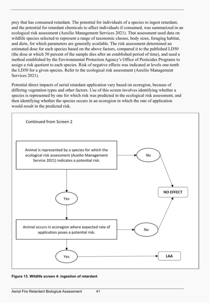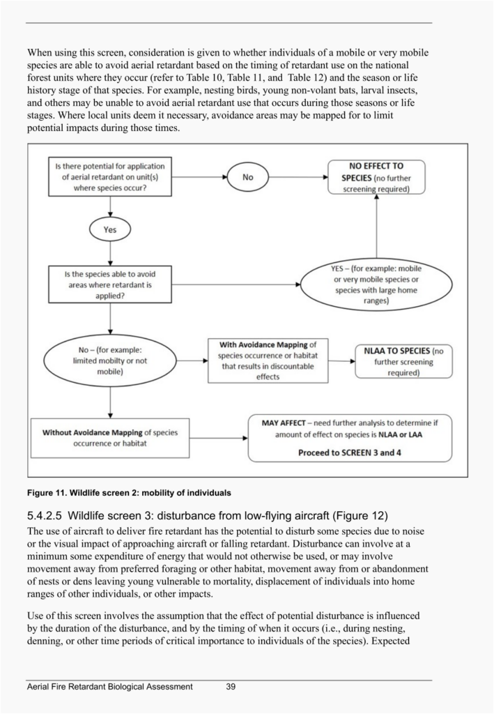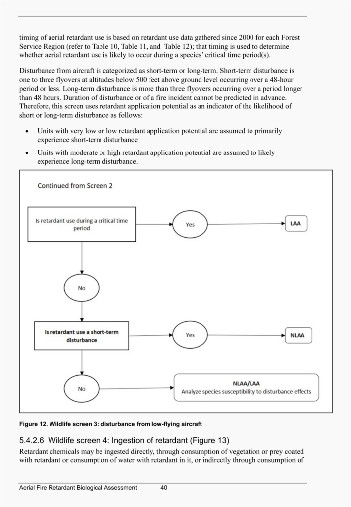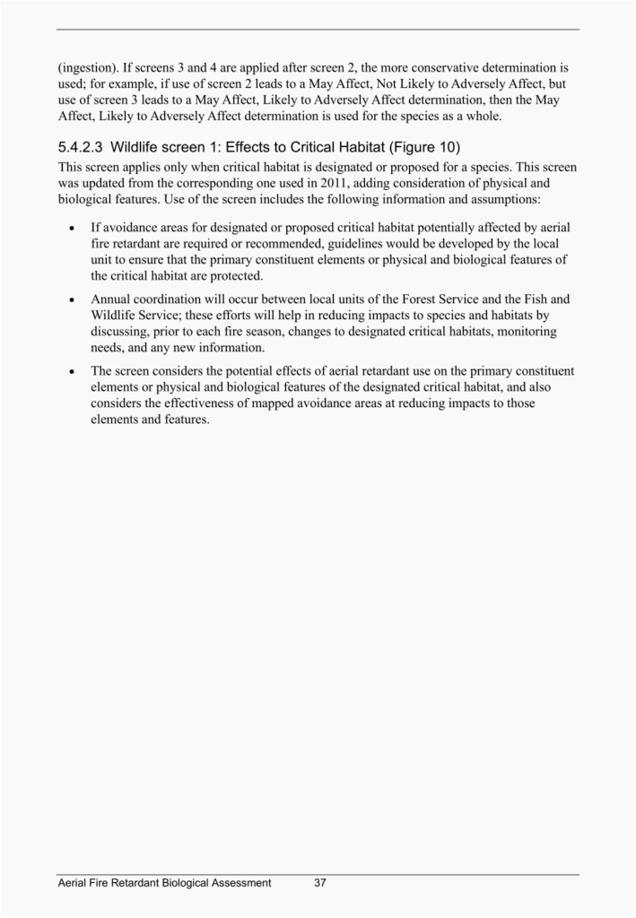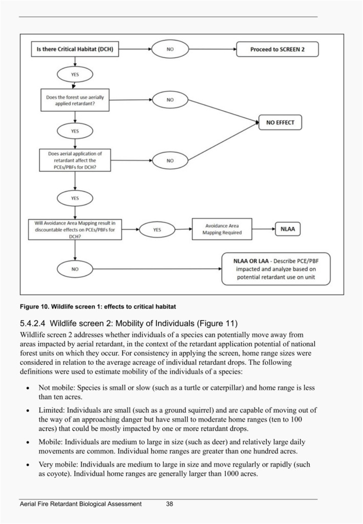 According to the Biological Opinion, a series of four Wildlife Screens, relating to the use of fire retardant, will take place during the designation of Critical Habitat under the Endangered Species Act. As existing plants and animals with protected status gain critical habitat designations, more and more land will be added to the list of avoidance areas.