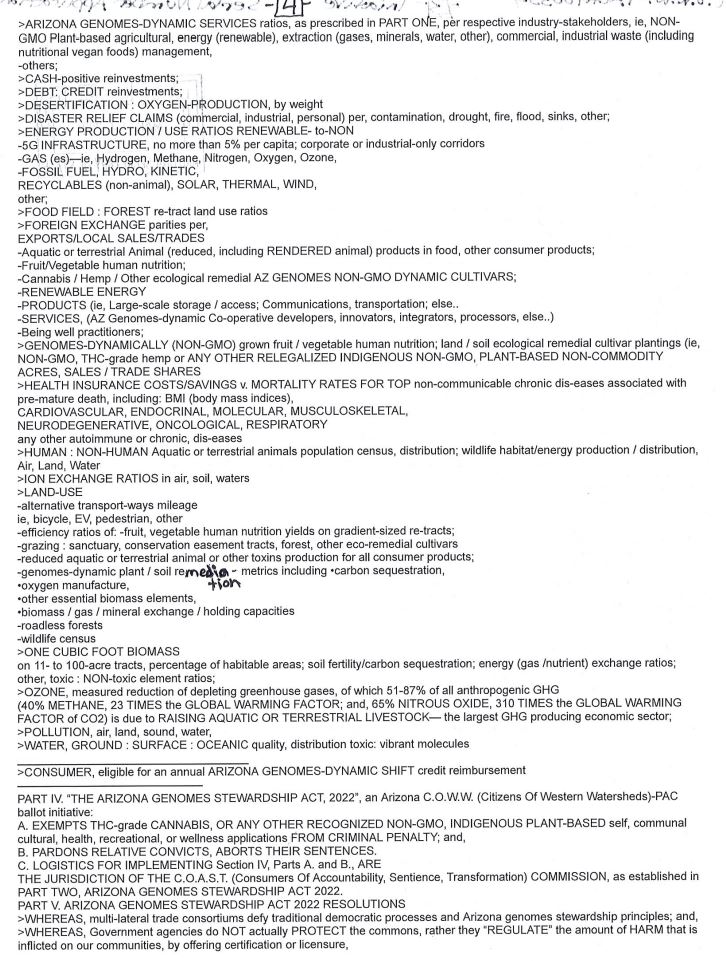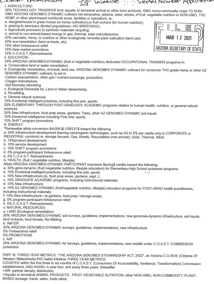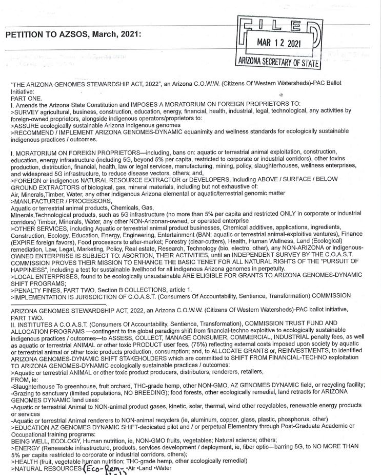 The Arizona Genome Stewardship Act is a Constitutional amendment that aims to protect indigenous genomes and aspires to drastically reduce or eliminate agriculture production and consumption while installing various land-use fines, prohibitions, and consumer surcharges.