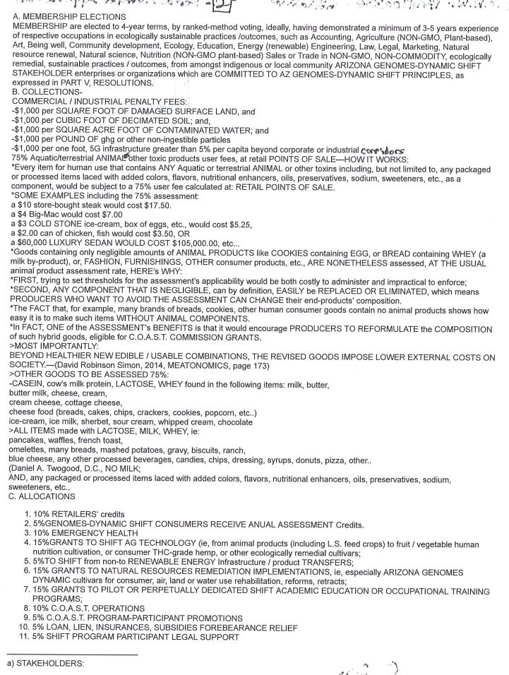The generated funds will be put into a trust fund and allocated among various programs, including grants and reinvestments in stakeholders who commit to shifting from “techno-exploitive” to “Arizona Genomes Dynamic” ecologically sustainable practices. They give multiple examples, including companies that change from slaughterhouses to greenhouses; ranchers who move from grazing lands to sanctuaries, limiting population, prohibiting breeding, and developing their allotments into wind and solar farms.