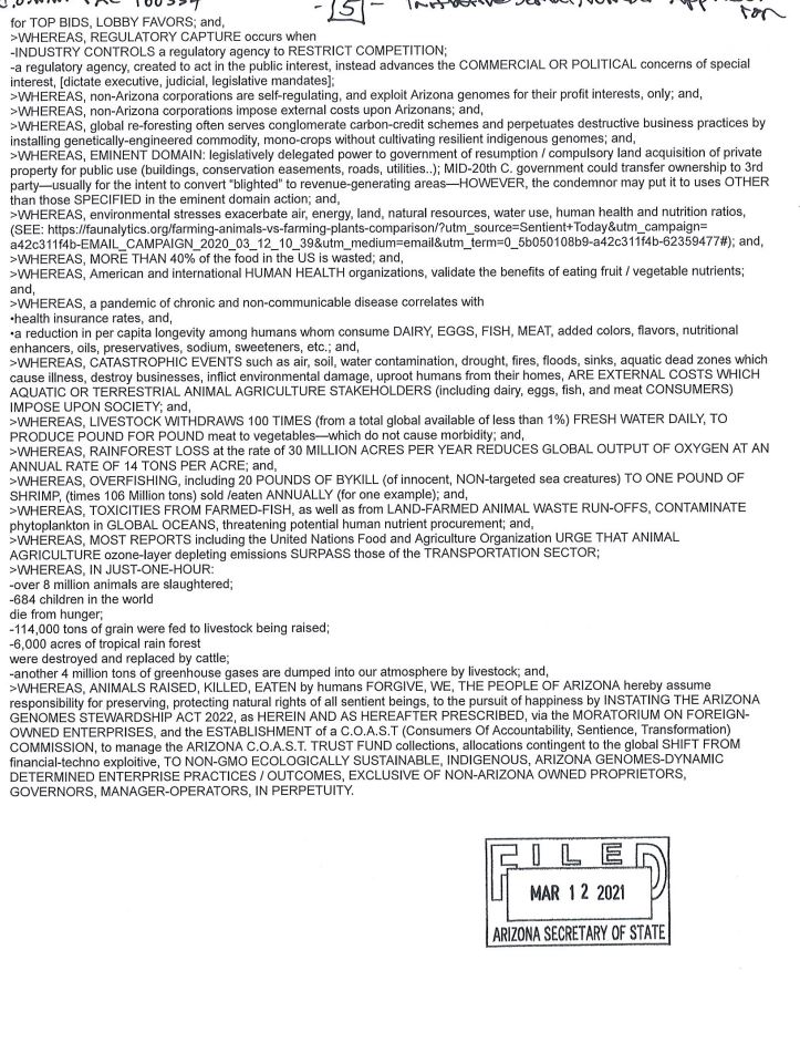 The Citizens of Western Watersheds have introduced a Constitutional Amendment in Arizona called the Arizona Genome Stewardship Act. The amendment seeks to establish what they call the “Consumers Of Accountability, Sentience, Transformation” (C.O.A.S.T.) Commission Trust Fund to assess, collect, and manage consumer, commercial, industrial, and exploitative, aquatic, and terrestrial animal and toxic consumer product penalty fees.