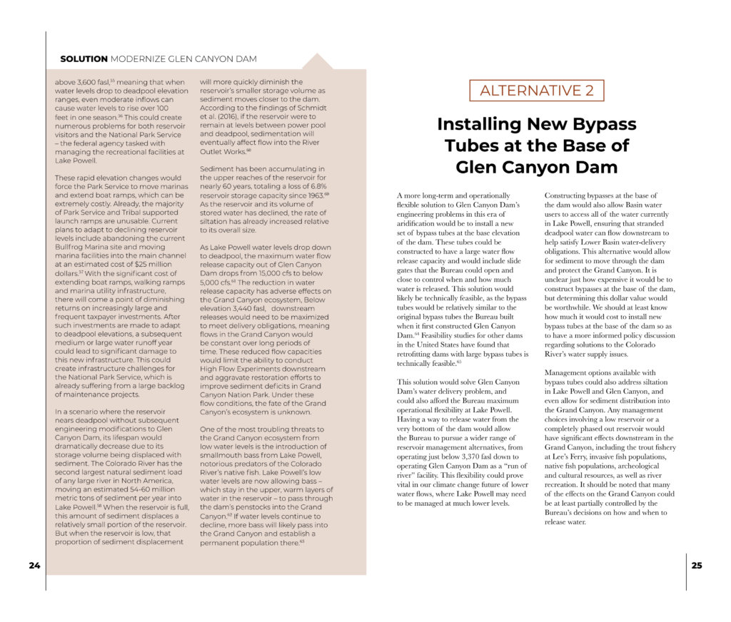 According to the 36-page report, the limited flow of the two river outlets is insufficient for the Colorado River Upper Basin states to meet the obligations of the Colorado River Compact Agreement. Additionally, they argue that the Colorado River could run dry if Lake Powell drops below the river outlets at 3,370 feet; at which point they claim, drastic alterations to Glen Canyon Dam will need to be made. As a solution, they provide two alternatives to “Modernize Glen Canyon Dam” that include retrofitting the river outlet works to release more water and Installing new bypass tubes at the base of Glen Canyon Dam.
