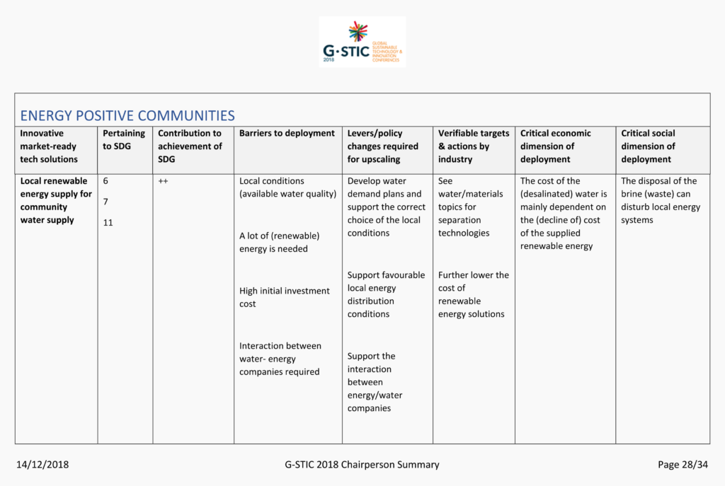 The first G-STIC event in 2017 called for the United Nations to embrace desalination to advance sustainable development goal 6. The next year, the 2018 conference in New York showcased market-ready and scalable solutions to world leaders that can be applied in their own countries to significantly contribute to the Sustainable Development Goals. G-STIC proclaimed that desalination is a viable solution while identifying the social, economic, and environmental challenges of implementing market-ready desalination for “community water supply.”