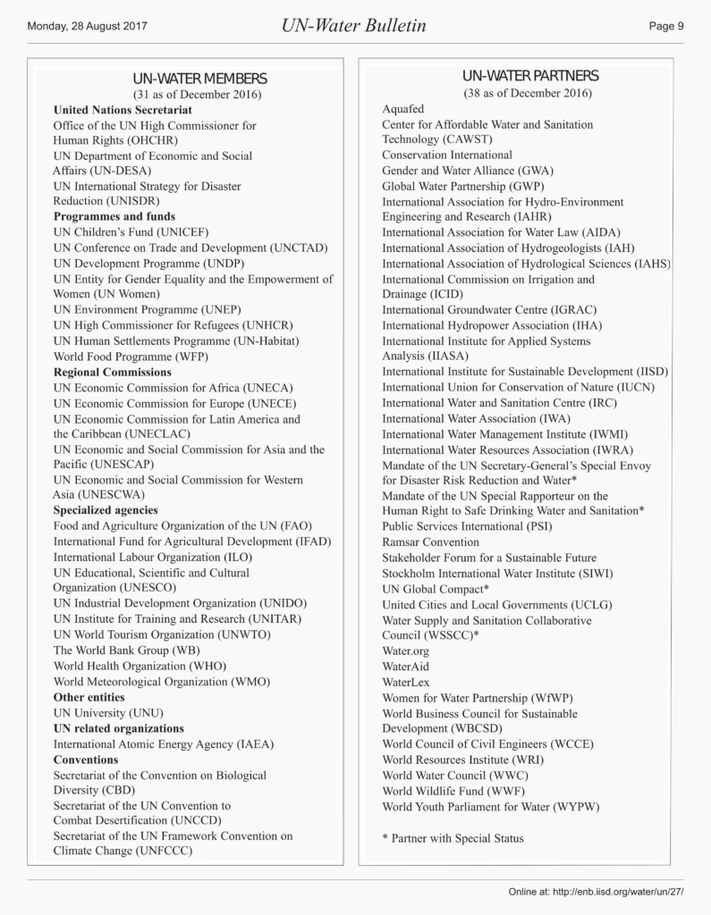 Some of the UNU-INWEH Unconventional Water Resource partners in the United States include the University of California, the New Mexico Institute of Mining and Technology, and A Ripple Effect PLC. However, the UN-Water members and partners are also involved which includes a massive list of global NGOs.