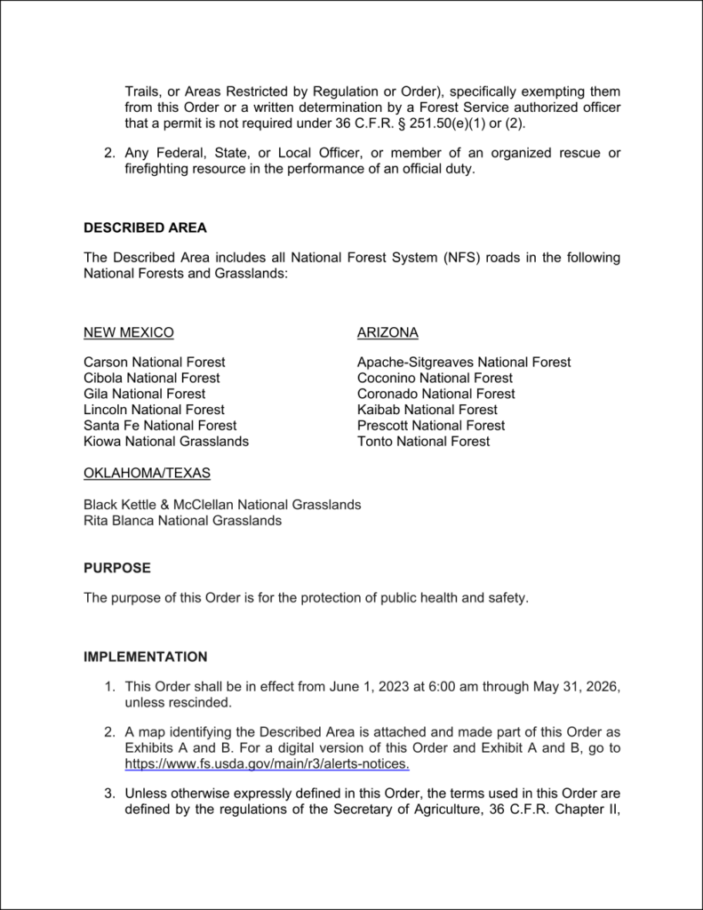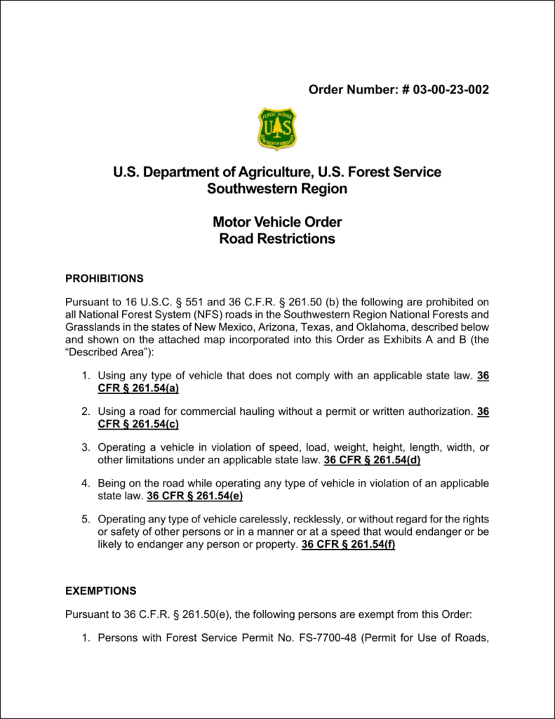 Order #03-00-23-002, issued by the U.S. Department of Agriculture and the U.S. Forest Service, imposes sweeping motor vehicle restrictions on National Forest System (NFS) roads in the Southwestern Region, encompassing parts of New Mexico, Arizona, Texas, and Oklahoma. While the order claims to be in the interest of public health and safety, it represents a problematic end-run around constitutional limitations on federal jurisdiction and encroaches on the rights of states to regulate their own roads. In this article, we will delve into the issues with this order and why it should be strongly opposed.