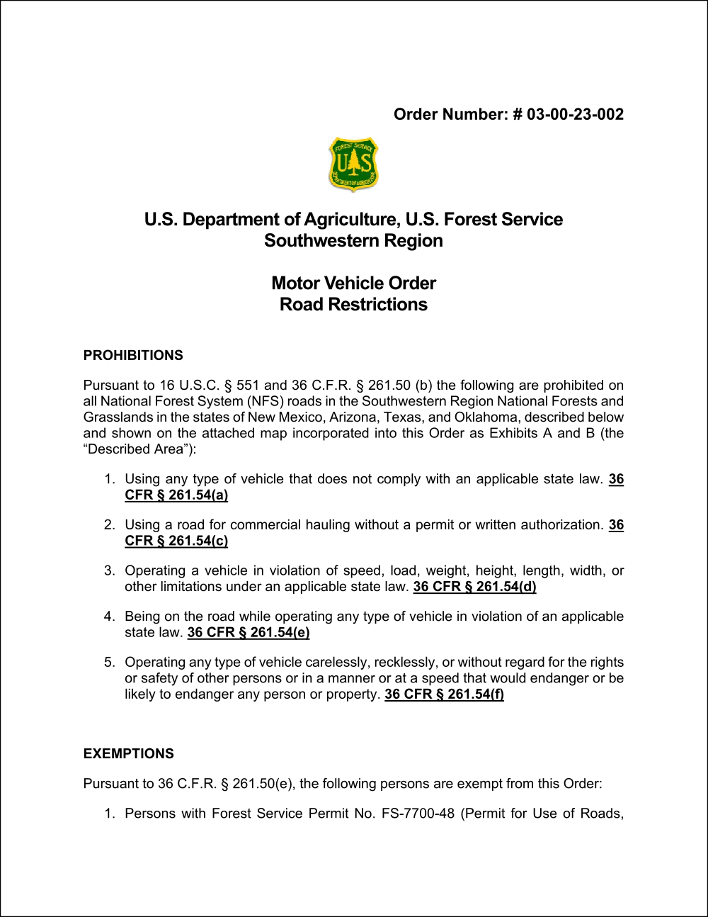 The order justifies its existence by citing 16 U.S.C. § 551 and 36 C.F.R. § 261.50 (b) as legal grounds for its imposition. However, these references do not grant the federal government the authority to dictate the specifics of motor vehicle usage on state roads. Instead, they grant the U.S. Forest Service general jurisdiction over National Forest System lands, not the authority to enforce state laws on state-owned roads.